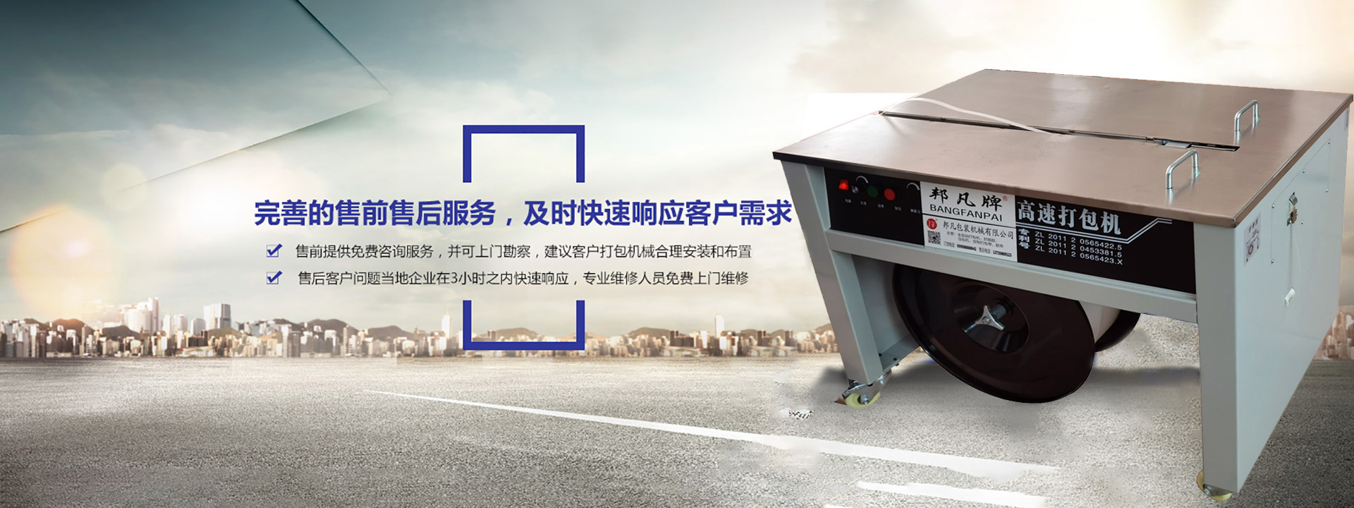 邦凡包裝用品有限公司 邦凡包裝用品有限公司 始創(chuàng)于2007年,數(shù)年來(lái),公司秉承質(zhì)量?jī)?yōu)先,服務(wù)至上的原則,贏(yíng)得了客戶(hù)的信賴(lài)。 公司主要生產(chǎn)經(jīng)營(yíng):邦凡牌自動(dòng)打包機(jī)、自動(dòng)封箱機(jī)、全自動(dòng)打包機(jī)等,大型設(shè)備有自動(dòng)封箱打包生產(chǎn)線(xiàn)、全自動(dòng)包裝流水線(xiàn)、自動(dòng)包裝生產(chǎn)線(xiàn)等。